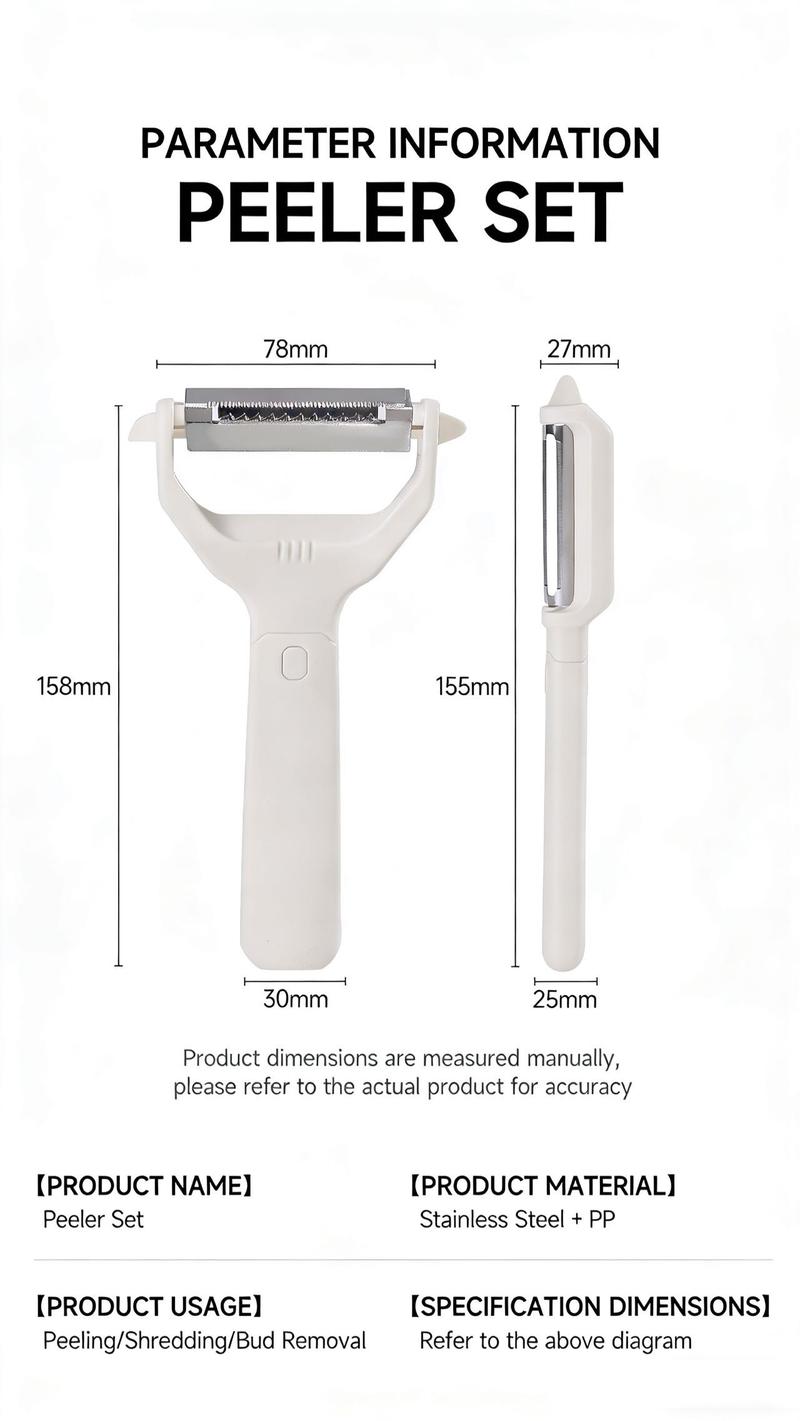 This 2-in-1 Peeler & Grater Set simplifies kitchen tasks. Tired of multiple tools? This set handles peeling, shredding, and removing sprouts effortlessly. It peels fruits and veggies, from soft peaches to tough sugar cane. Shreds carrots and potatoes in seconds for salads and stir-fries. Removes buds and blemishes with the built-in digger. No more finger picking!